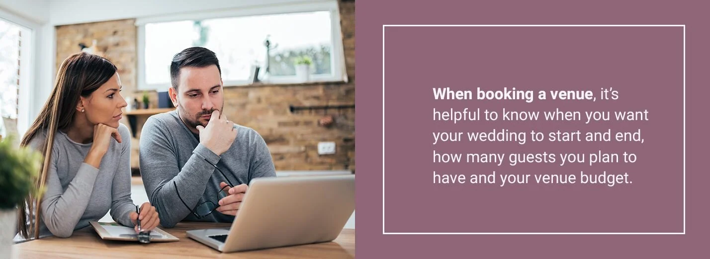You will not need to have every detail set in stone before you visit a venue. However, it's helpful to have a few wedding dates in mind, know how many guests you plan to have and how much you can spend on your venue before visiting. It also helps to have a wedding vision before you book a venue, so you can decide if the setting meets your wants and needs. For example, do you imagine an indoor or outdoor reception? Are you picturing lots of bold colors or a more calm and airy look? When you visit different locations, keep your vision in mind and see if it matches the venue.